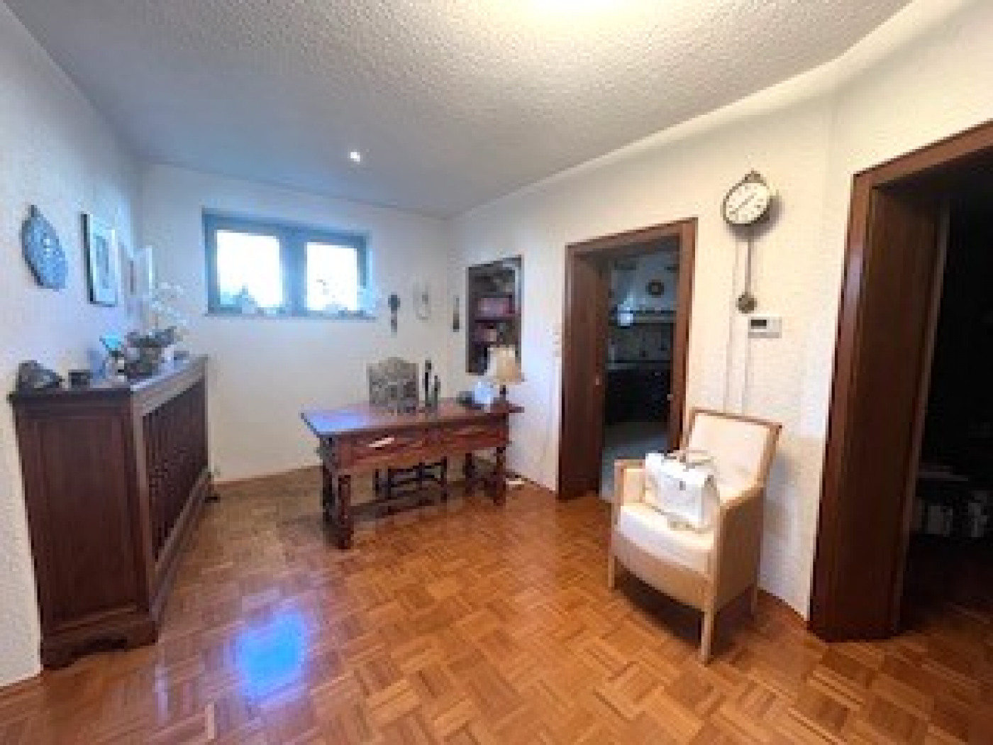 Das lichtdurchflutete Wohn-/Esszimmer ist mit hochwertigem Parkett ausgestattet. Im Treppen- sowie Dielenbereich findet man hellen Marmor. In der Küche, im Bad, G-WC und in den Kellerräumen sind Fliesen verlegt.